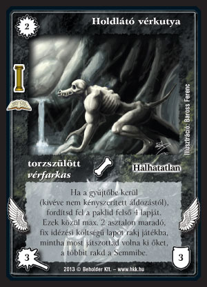 Holdlátó vérkutya (7): Itt az első nem-galetki lap (4 ilyen is van a Zénben, plusz Mer-gah, mint határeset). Először is tisztázzunk 2 dolgot: korábbi verziójához hasonlóan ez is csak asztalról gyűjtőbe kerülésnél működik, és nem számít húzásnak, azonban keresésnek igen. "keresés még az is, ha a paklimból, vagy annak x lapjából (és x akár egy is lehet), vagy a kiegészítő pakliból a saját döntésem szerint, vagy valamilyen feltétel alapján vehetek kézbe lapokat, vagy rakhatok ki az asztalra, a gyűjtőbe vagy a pakli tetejére."